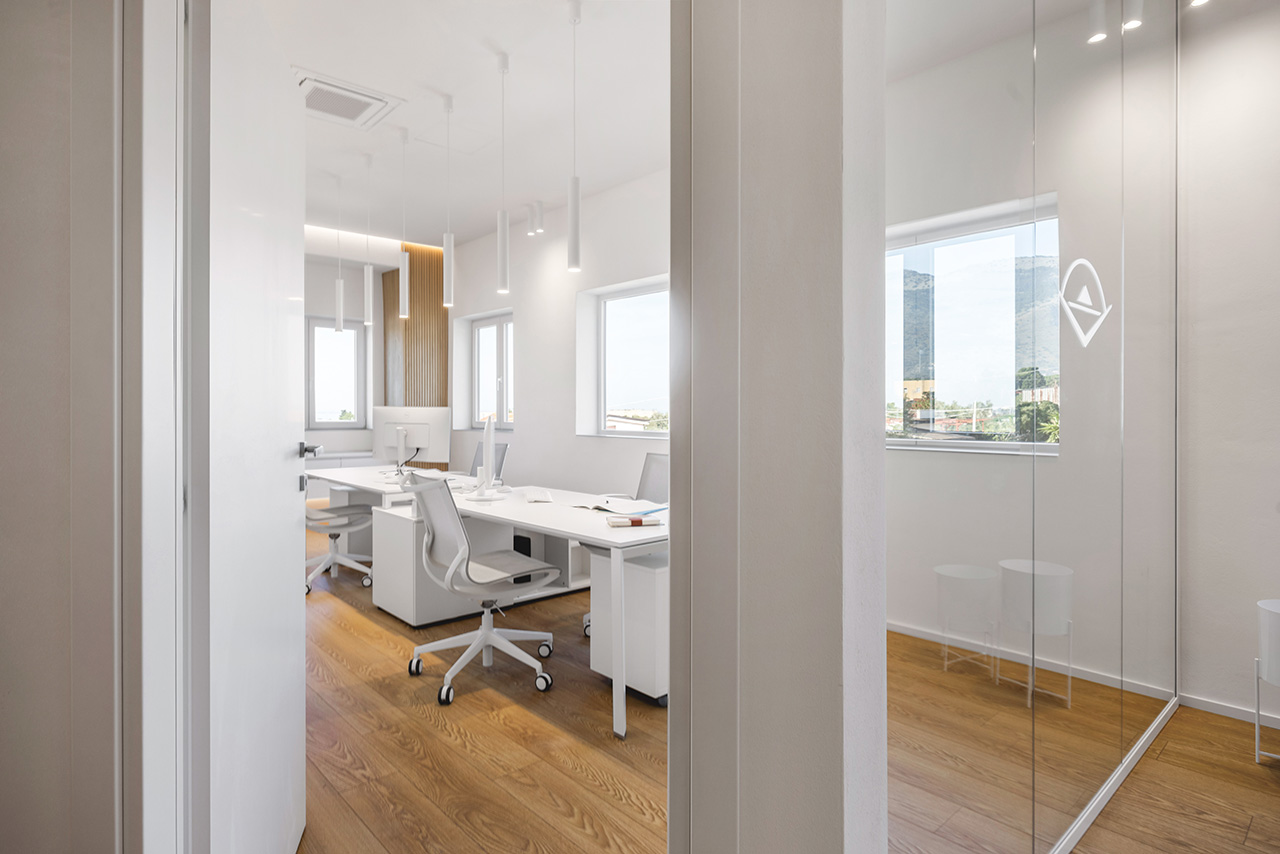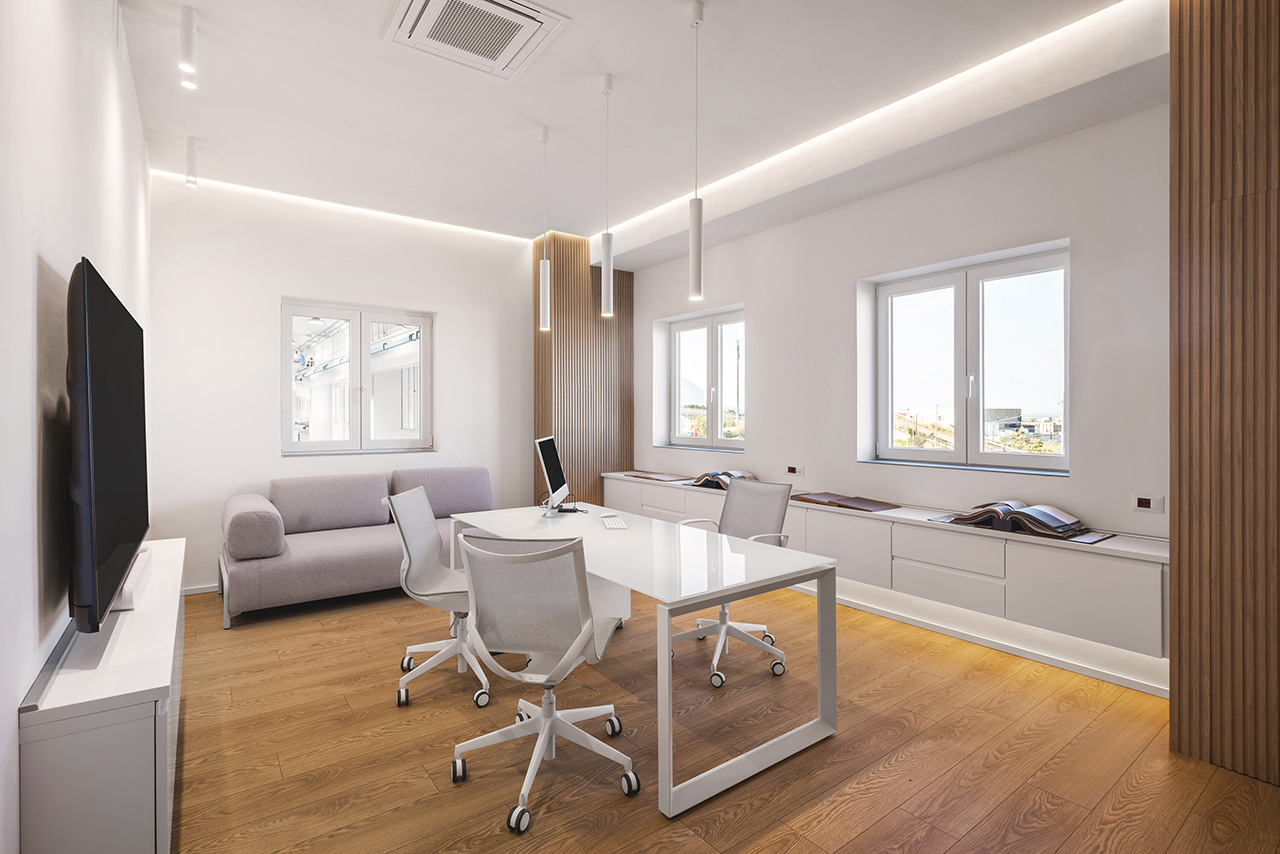 In genere preferisco la proporzione aurea alla simmetria, ma qui l’ho utilizzata per dare rigore, applicando all’interno degli ambienti le proporzioni della regola aurea. La trasparenza trasmette autorevolezza, mentre il layout protegge la privacy di aree direzionali e relax. Per governare la continuità visiva ho allineato volumi e illuminazione: tavolo riunioni e postazioni operative hanno lo stesso ingombro e identiche finiture. Il confine è fluido: il visitatore percepisce l’operatività del cantiere e delle aree di progettazione, ma i flussi restano distinti e ordinati grazie all’uso tecnico delle pareti vetrate monolitiche.