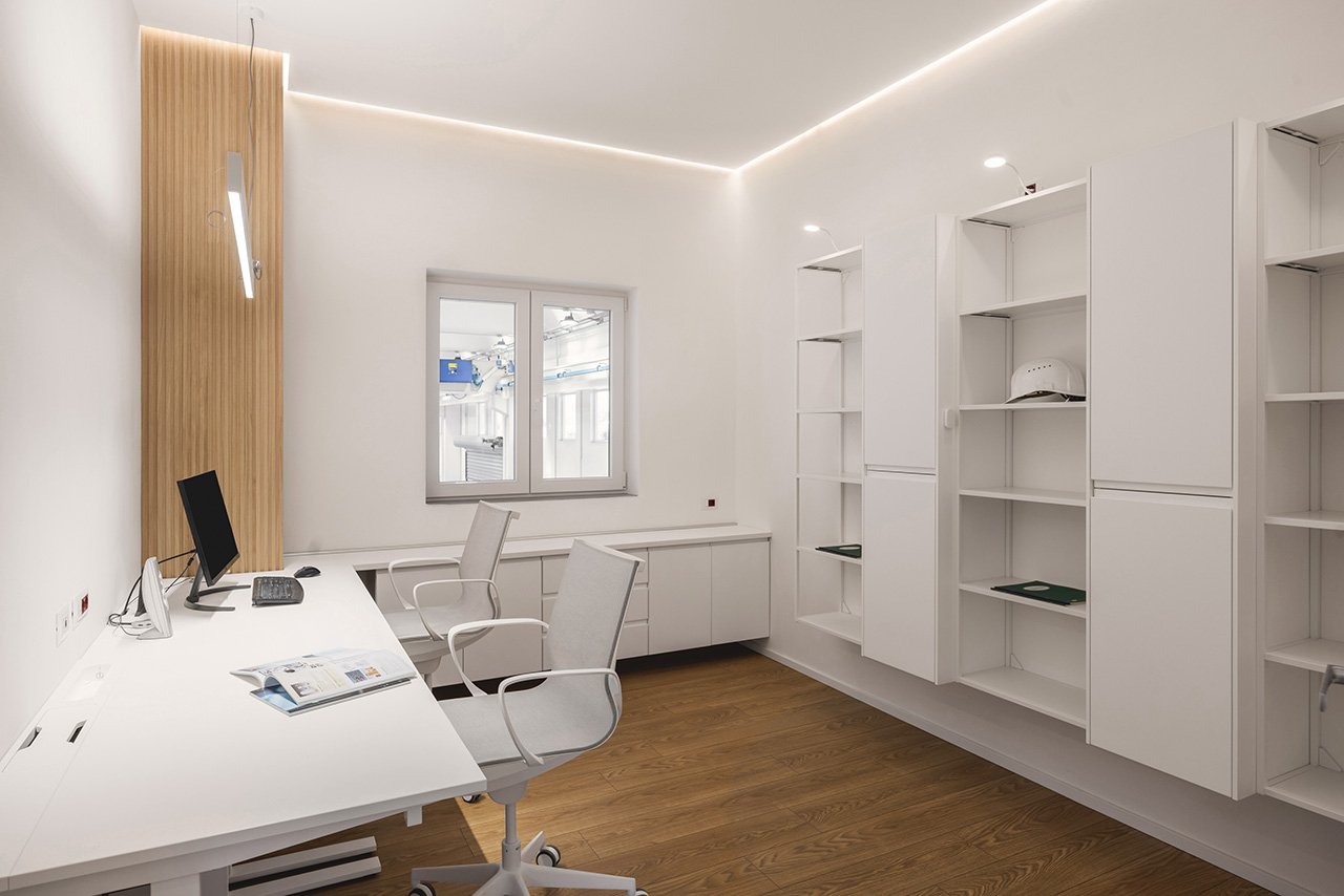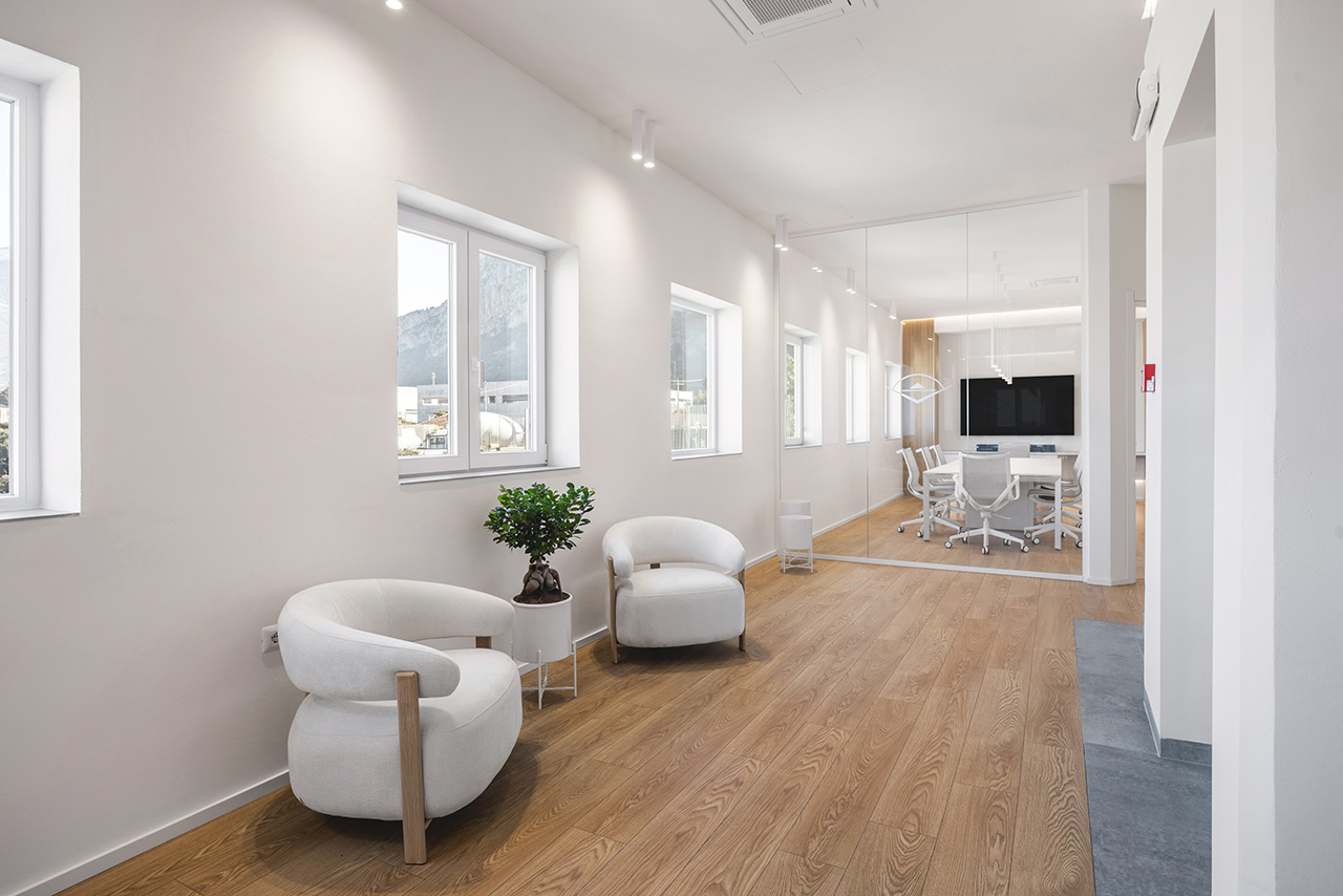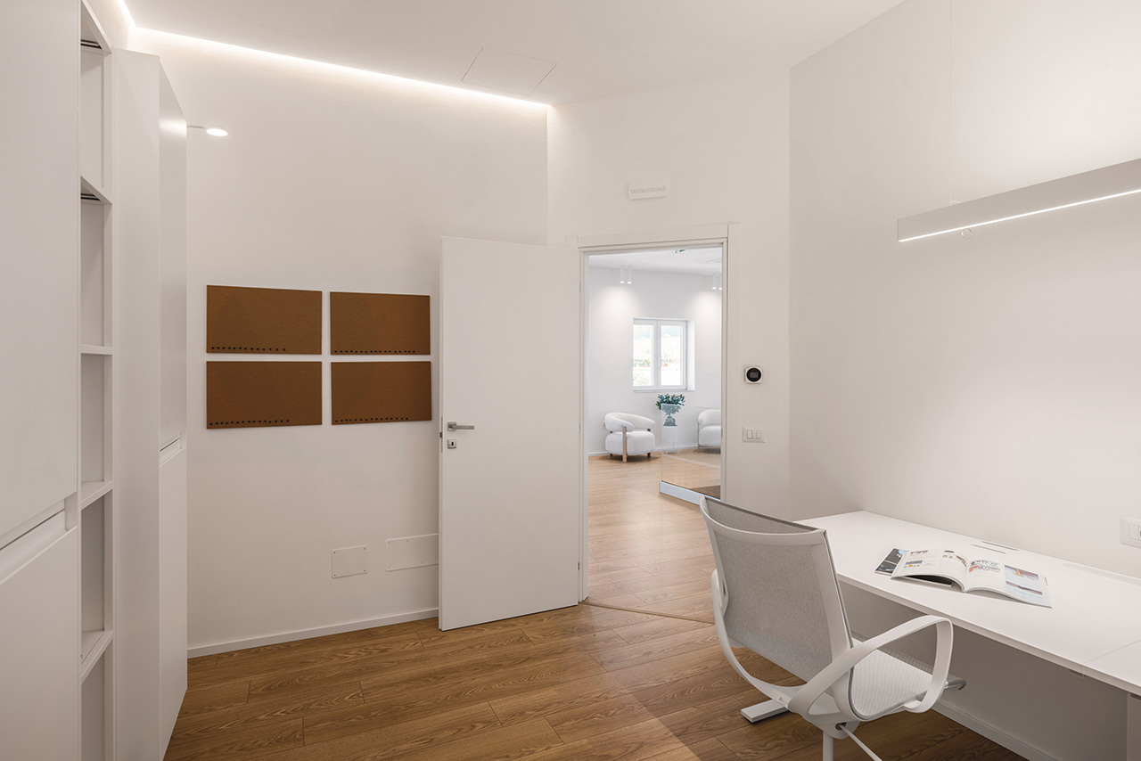 Ho messo in relazione il pavimento Prestige Gold Hydro di Skema, nel decoro Rovere Sole, con pannellature in vero rovere impiallacciato, ricercando una corrispondenza cromatica precisa tra materiali che hanno natura e comportamento differenti. Il legno segue una gerarchia funzionale: più presente nelle aree di rappresentanza, più essenziale in quelle tecniche. Il criterio ordinatore è, sempre, la regola aurea: le doghe rivestono esattamente un terzo delle superfici verticali su cui sono collocate. Questa continuità tra pavimento e pareti crea una scatola architettonica leggibile e coerente, dove la texture naturale del rovere mitiga il rigore tecnico dell’ambiente e guida l’occhio attraverso le diverse zone del piano. Un dettaglio tecnico: ho inserito i giunti di dilatazione modificando i profili delle pareti divisorie e nelle soglie delle porte, mantenendo il pavimento flottante senza interruzioni visive antiestetiche, completando il tutto con uno zoccolino bianco minimal.